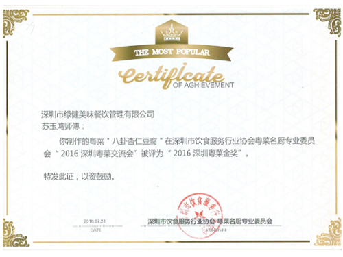 我司研發(fā)部丁總帶隊,攜大廚蘇玉洪、黃燕周參加了由深圳市飲食服務行業(yè)協(xié)會粵菜名廚專業(yè)委員會舉辦的“2016深圳粵菜交流會”。我司大廚蘇玉洪制作的"八卦杏仁豆腐"、黃燕周制作的“如意蝦燈”及“蓮蓬扣肉”被評為2016年深圳粵菜金獎。